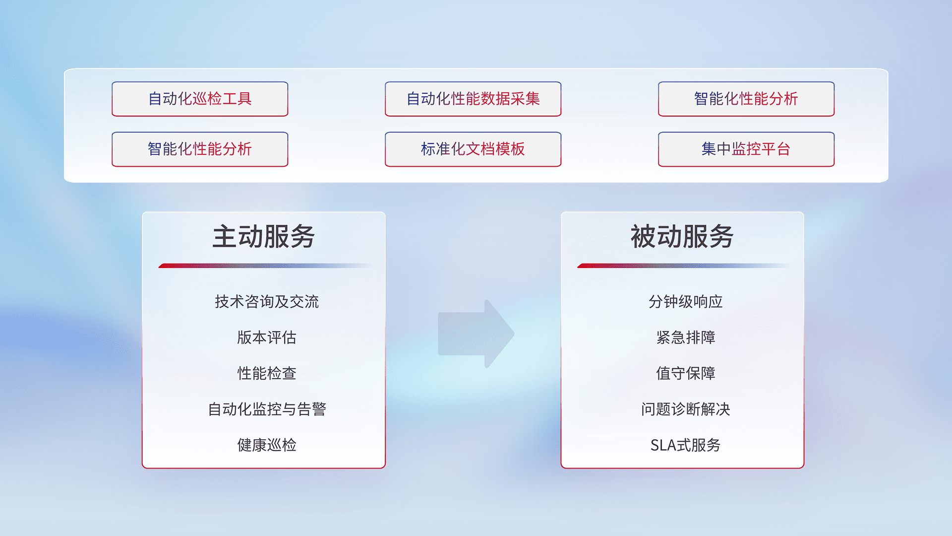 智能化工具和标准化文档,,,,保障服务质量,,,,提供主动服务(包含技术咨询、、版本评估、、、、性能检查、、、、自动化监控与告警、、、、健康巡检)和被动服务包含(分钟级响应、、、紧急排障、、、、值守保障、、、问题诊断解决、、SLA服务)。。。