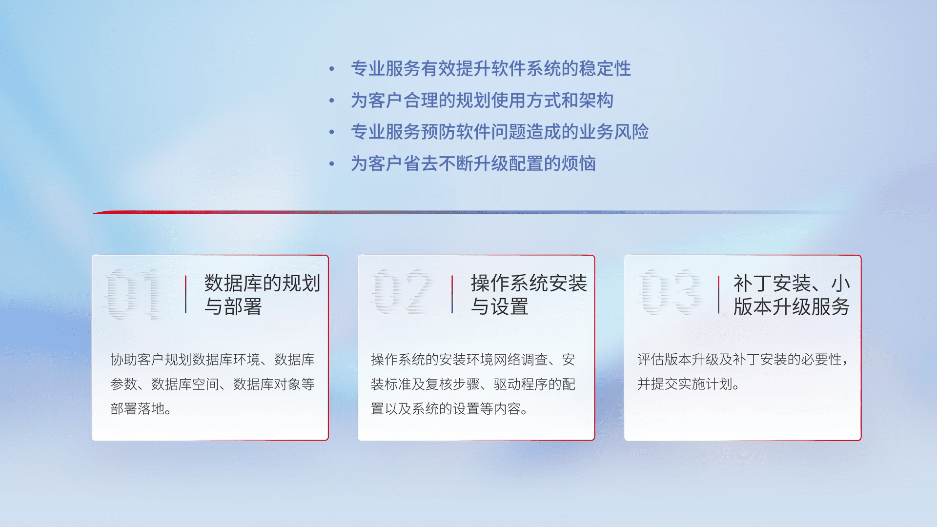 为客户提供软件规模升级、、、、快速部署、、、按需配置的专业服务,,,,从数据库的规划与部署到操作系统的安装与设置,,,再到补丁安装和小版本升级提供支持。。。